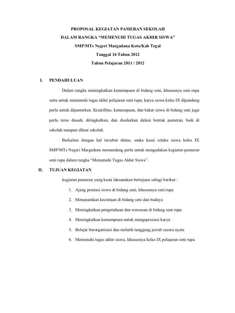 Contoh Proposal Kegiatan Pameran Seni Budaya Berbagi Contoh Proposal from imgv2-2-f.scribdassets.com Kami juga sangat mengharapkan dukungan berupa moril. Seni biasa diartikan sebagai sebuah keindahan yang timbul lewat kreatifitas seseorang. Proposal pameran seni rupa sma 233 jakarta. Atas perhatian dan kerja sama bapak/ibu. Meningkatkan apresiasi siswa terhadap karya seni rupa. Proposal ini sebagai bentuk untuk menggambarkan rancangan. Contoh proposal seni budaya ( pameran seni ). Memberikan wadah bagi siswa untuk berekpresi dan berkreasi seni.